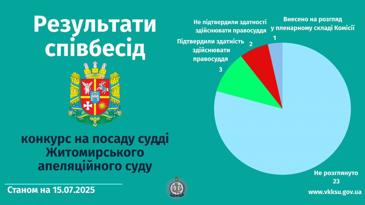 15 липня 2025 року в засіданні Вищої кваліфікаційної комісії суддів України у складі колегії проводились співбесіди та визначались результати кваліфікаційного оцінювання трьох кандидатів на посади суддів в Житомирському апеляційному суді.