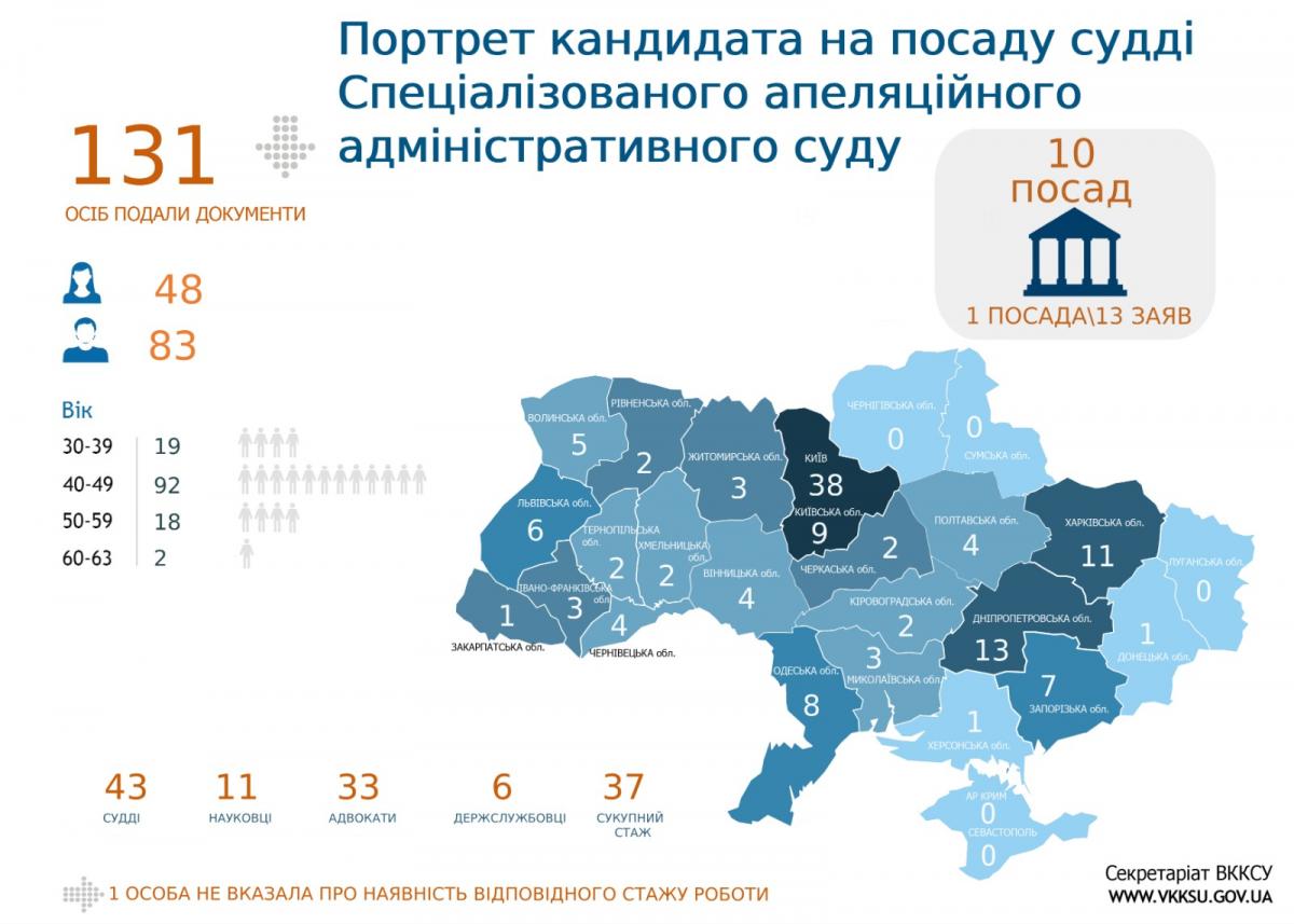 До СААС на 10 вакантних посад суддів заяви подала 131 особа. Більшість чоловіки – 83 (63%), жінок – 48 (37%). Як і в конкурсі до СОАС, найчисельніша вікова група 40–49 років.